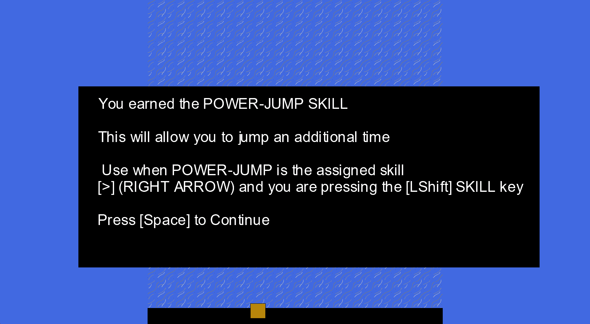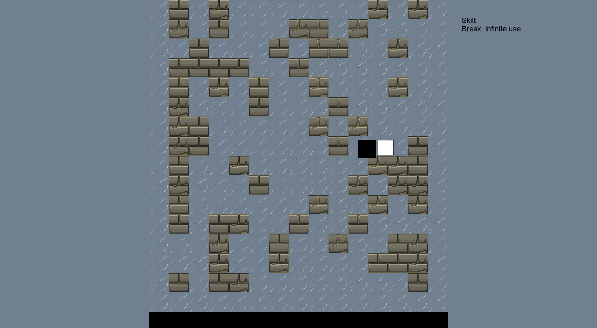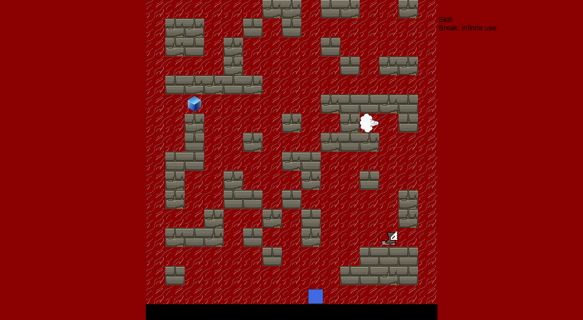 The player has unlimited uses of double jumps [SPACE] and the first skill: BREAK. Which allows you to destroy the block you jump into